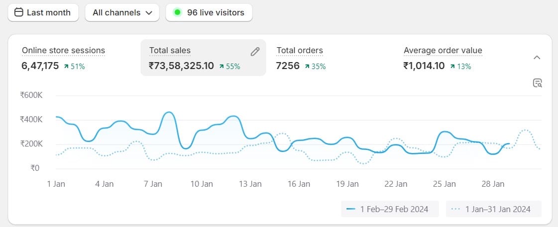 Over a ~60 day period, we helped scale their store to ₹73L+ in total tracked revenue, while improving key conversion metrics.